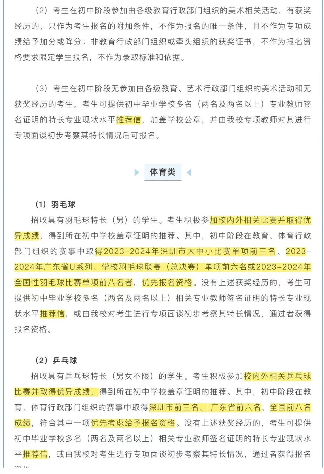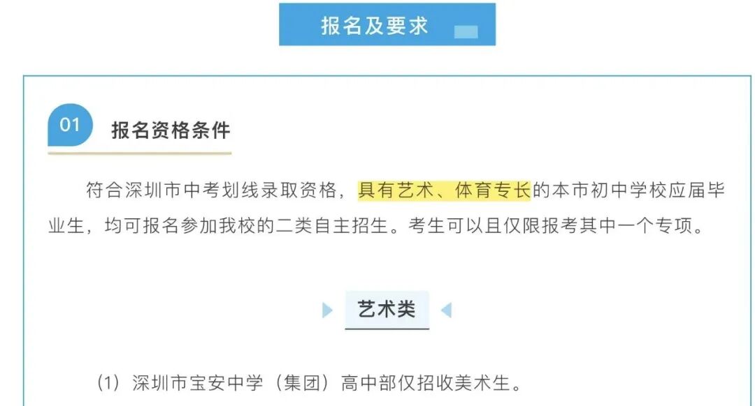 自主招生是深圳部分高中针对具有拔尖创新潜质或在理工科技、人文社科、艺术、体育等方面有特长的应届初中毕业生开展的招生方式。