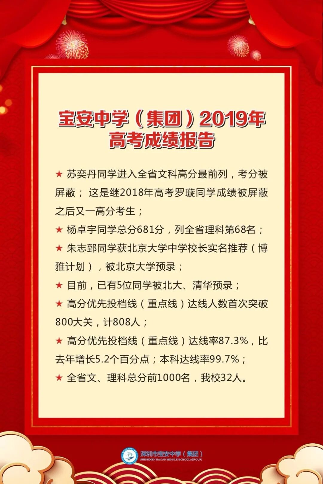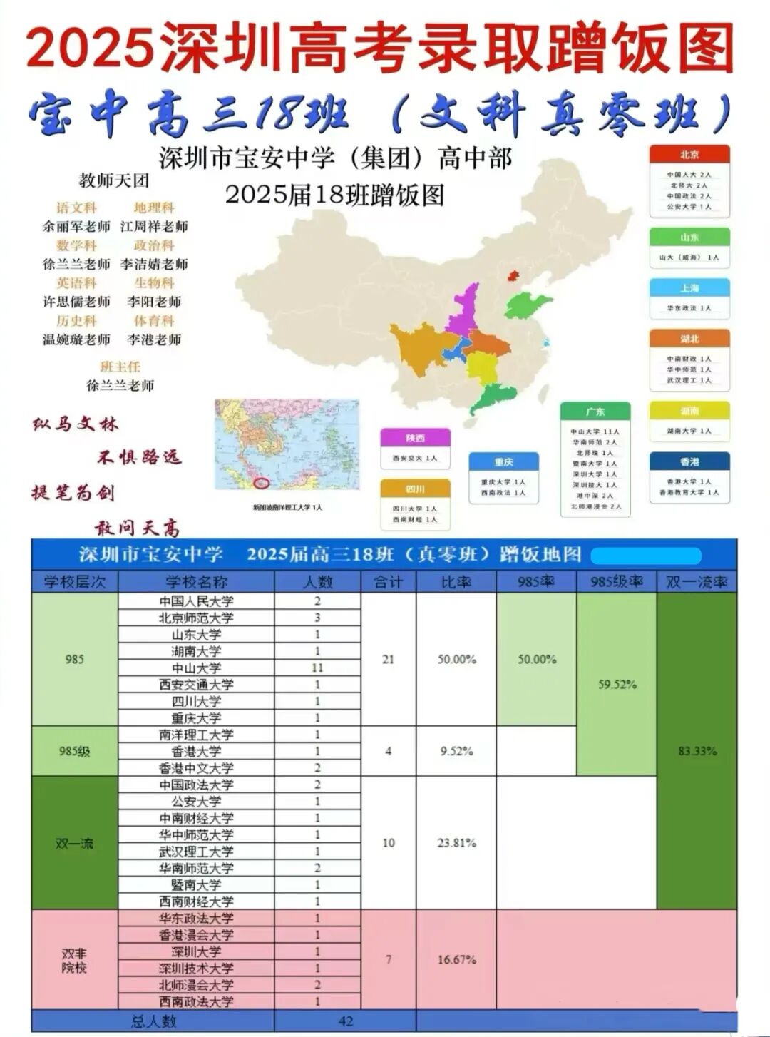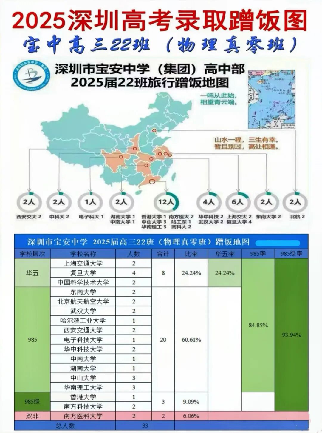 高考红榜共计985人,其中,清华、北大、港大各裸分录取1人,复旦1人,人大2人,港中文2人,浙大2人,南京大学2人,武汉大学1人,哈工大3人,北航3人,深理工2人......