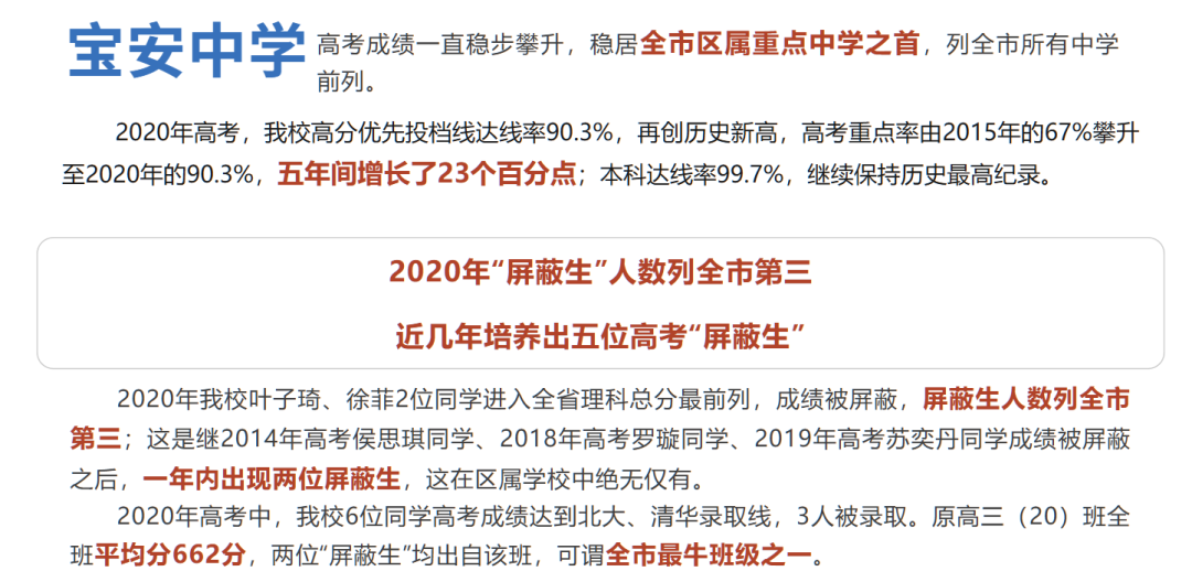 深圳市宝安中学(简称宝中)成立于1984年,是广东省首批国家级示范性普通高中、广东省唯一联合国教科文组织教育联席学校、北京大学“中学校长实名推荐制”推荐资质学校,入选清华大学“领军人才计划”(同时具备这两项资质的学校深圳仅有三所)。连续20年荣获深圳市高考先进单位和高考卓越奖。