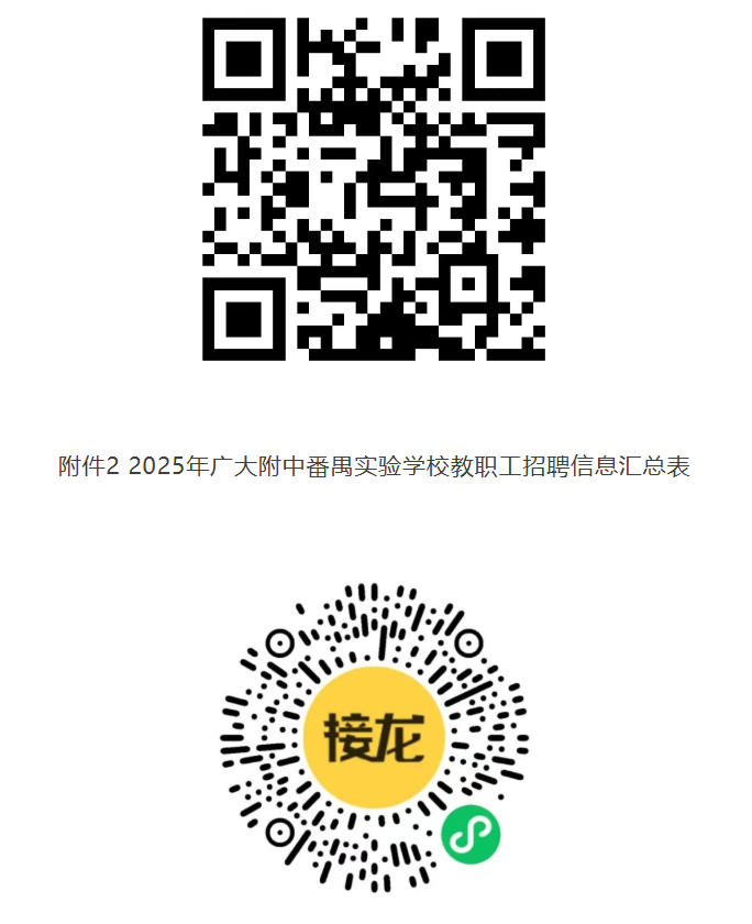 (一)报名时间 2025年9月30日起至10月13日止 (二)报名方法 1.在文末扫码下载并填写《2025年广大附中番禺实验学校教职工应聘信息登记表》(附件1)。上交资料: (1)应聘登记表 (2)个人简历 (3)自荐书(亲笔书写) (4)身份证(正反面复印在同一页) (5)学历学位证 (6)就业推荐表(仅应届生提供) (7)学业成绩单(仅应届生提供) (8)其他相关证明材料(如初级会计资格证等) (9)相关获奖荣誉证明材料 以上资料按顺序命名,放入同一个文件夹内打包,将文件夹以“姓名+手机+应聘岗位”命名(如:张三+XX手机号+财务人员),发送到邮箱gfpszp@163.com。 2.在线扫码填写《2025年广大附中番禺实验学校教职工招聘信息汇总表》(附件2)。 注:因应聘邮件数量庞大,应聘材料恕不一一答复、退还。 (三)资格审核 收到应聘通知的人员需按我校规定的时间、地点进行报考资格审核。参加资格审核时需提交以下材料: 1. 2025年广大附中番禺实验学校教职工应聘信息登记表(扫码下载附件1,双面打印并签名)。 2. 有效身份证件。 3. 本人所取得的学历、学位证书,应届毕业生提供就业推荐表、成绩单(须教务处盖章)等材料。留学回国人员还需提供由教育部留学服务中心出具的国(境)外学历、学位认证函等有关证明材料;在国(境)内就读取得国(境)外学历、学位的人员,需取得由教育部所属的相关机构出具的学历、学位认证函,上述有关证明材料与本人学历学位证书一并提交。 4. 报考岗位条件要求的其他相关证明材料:如中共党员(含中共预备党员)证明、职业资格证书获奖证书和业绩成果等复印件。 注: 未按规定时间参加应聘的,视为自动放弃。 证件(证明)不全且不能在资格审核结束之日前补全的或与报考资格条件不符的,取消面试资格。 所有证件、证明材料的原件审核后当场退回。 请注意保持通讯畅通,留意短信、电话通知(择优通知,恕不一一回复)。 资格审核合格者,进入结构化面试环节。 (四)结构化面试 主要测试考生的专业素养、沟通表达能力、应变能力与执行力、发展潜力,举止仪表等。