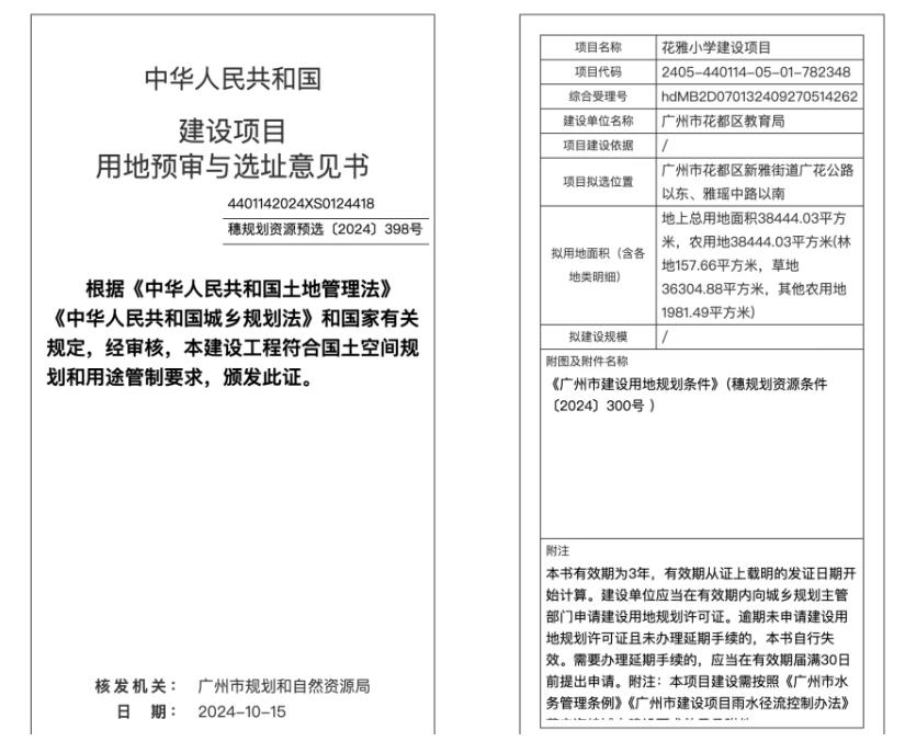 2025年10月31日,广州市规划和自然资源局官网发布了花雅小学建设项目的建设项目用地预审与选址意见书受理公示。项目拟新建花雅小学,办学规模为36班,共1620个学位。项目主要建设内容包括新建教学综合体约16240平方米、室内体育用房约2460平方米,并建设室外体育场地、绿化工程、道路广场等配套工程。项目施工计划工期为2025年11月开工,2027年5月完成建设。