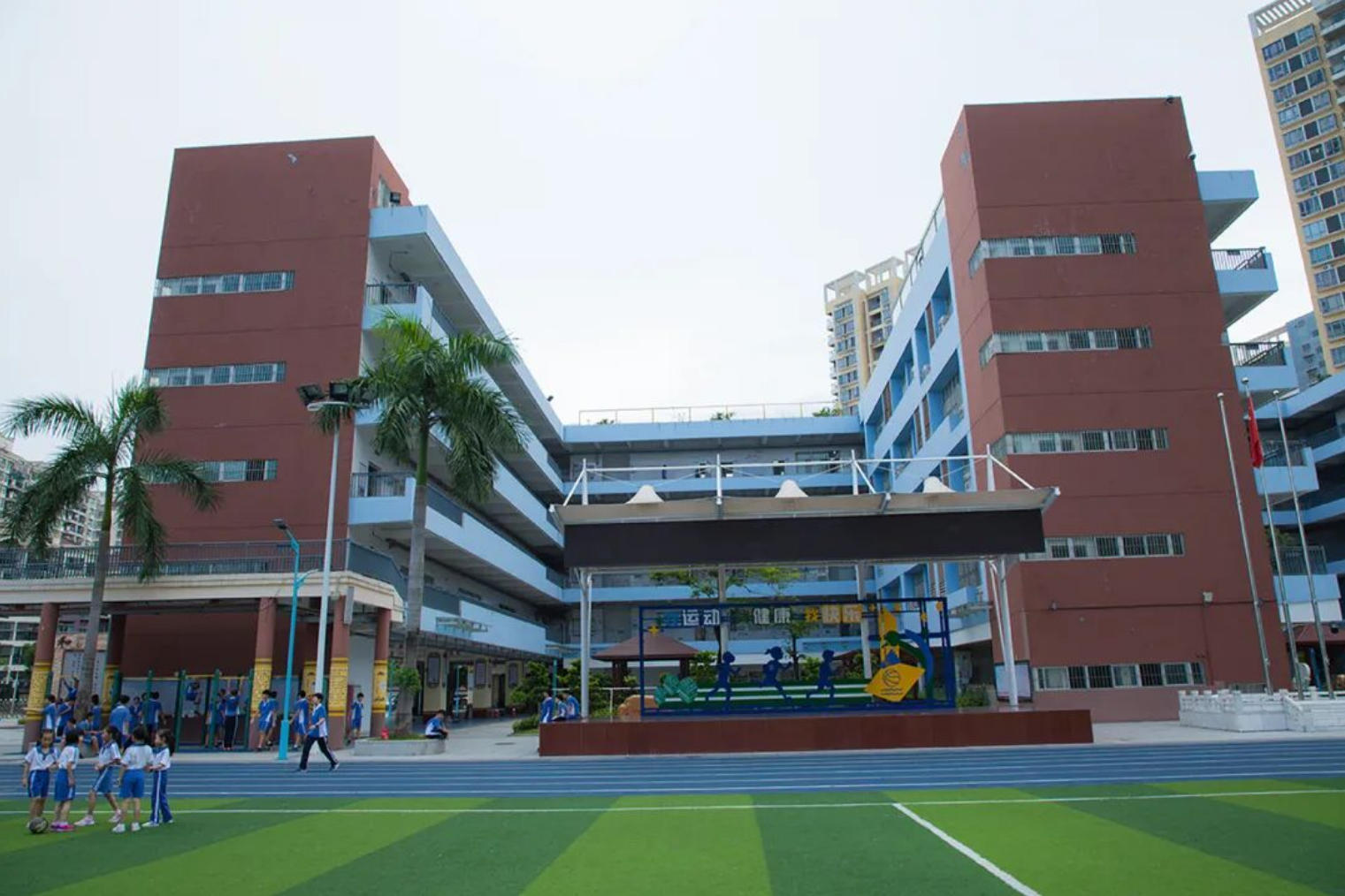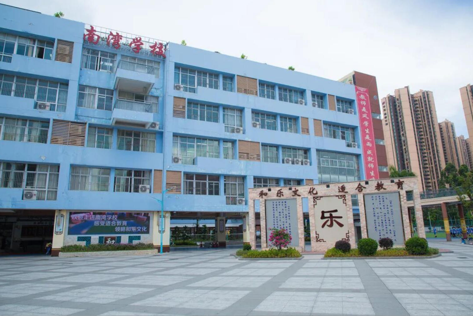 南湾学校创建于2009年8月,地处龙岗区南湾街道康乐社区,是一所区属九年一贯制公办学校。学校服务于康乐社区、宝岭社区等,南湾学校的成立,部分缓解了南湾街道片区学位紧张的问题,被评为龙岗区政府2009年十大民心工程之一。学校占地面积27456.21平方米,建筑面积16195平方米,设计规模36个班。学校现有56个班,人数近3000人,教职工为200多人,办学规模扩大迅速,学校规模排在龙岗区义务教育学校的前列。校内环境优美,设备先进齐全,是众多莘莘学子的理想之处。